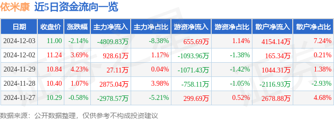 12月3日的资金流向数据方面,主力资金净流出4809.83万元,占总成交额8.38%,游资资金净流入655.69万元,占总成交额1.14%,散户资金净流入4154.14万元,占总成交额7.24%。