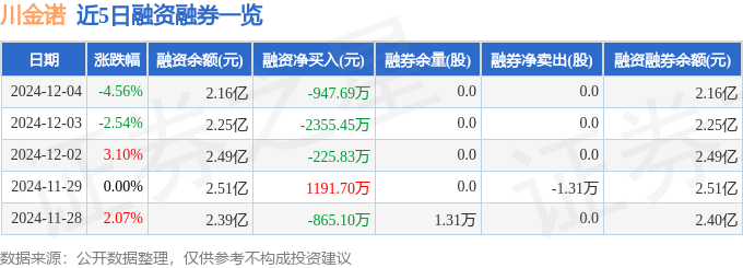 川金诺融资融券信息显示,融资方面,当日融资买入3365.49万元,融资偿还4313.18万元,融资净偿还947.69万元。融券方面,融券卖出0.0股,融券偿还0.0股,融券余量0.0股,融券余额0.0万元。融资融券余额2.16亿元。