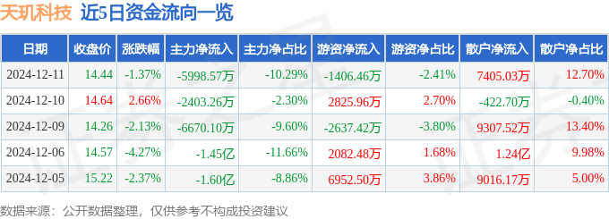 截至2024年12月11日收盘,天玑科技(300245)报收于14.44元,下跌1.37%,换手率13.01%,成交量40.49万手,成交额5.83亿元。
