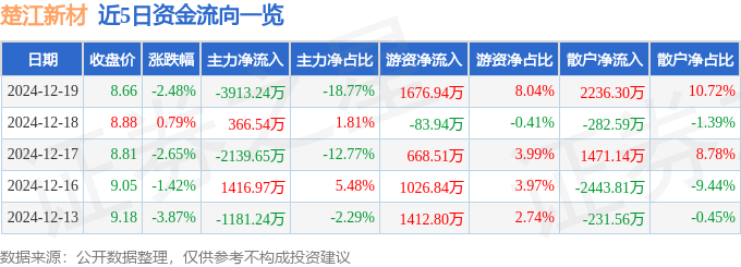 12月19日的资金流向数据方面,主力资金净流出3913.24万元,占总成交额18.77%,游资资金净流入1676.94万元,占总成交额8.04%,散户资金净流入2236.3万元,占总成交额10.72%。