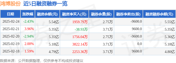 鸿博股份融资融券信息显示,融资方面,当日融资买入6694.47万元,融资偿还4734.69万元,融资净买入1959.79万元。融券方面,融券卖出0.0股,融券偿还9600.0股,融券余量2.75万股,融券余额38.72万元。融资融券余额5.55亿元。