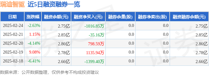 瑞迪智驱融资融券信息显示,融资方面,当日融资买入4779.7万元,融资偿还5796.55万元,融资净偿还1016.85万元。融券方面,融券卖出0.0股,融券偿还0.0股,融券余量0.0股,融券余额0.0万元。融资融券余额2.75亿元。