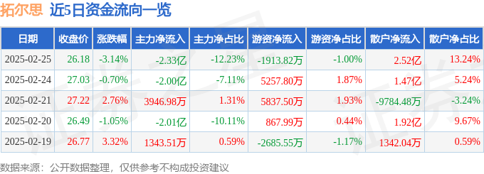 2月25日的资金流向数据方面,主力资金净流出2.33亿元,占总成交额12.23%,游资资金净流出1913.82万元,占总成交额1.0%,散户资金净流入2.52亿元,占总成交额13.24%。