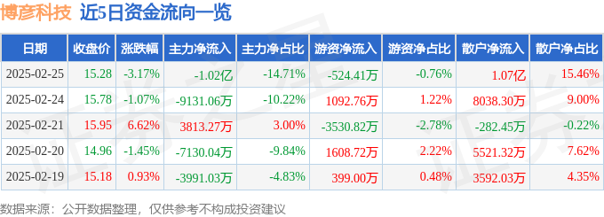 2月25日的资金流向数据方面,主力资金净流出1.02亿元,占总成交额14.71%,游资资金净流出524.41万元,占总成交额0.76%,散户资金净流入1.07亿元,占总成交额15.46%。