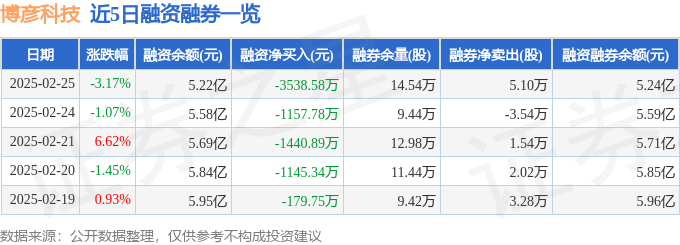 博彦科技融资融券信息显示,融资方面,当日融资买入6108.71万元,融资偿还9647.29万元,融资净偿还3538.58万元。融券方面,融券卖出5.11万股,融券偿还100.0股,融券余量14.54万股,融券余额222.17万元。融资融券余额5.24亿元。