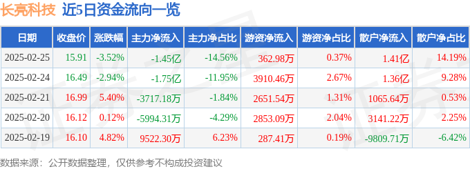 2月25日的资金流向数据方面,主力资金净流出1.45亿元,占总成交额14.56%,游资资金净流入362.98万元,占总成交额0.37%,散户资金净流入1.41亿元,占总成交额14.19%。