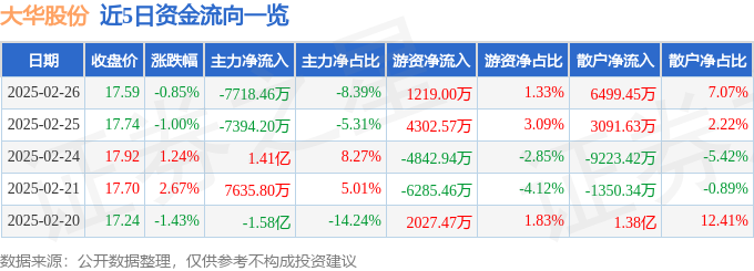 截至2025年2月26日收盘,大华股份(002236)报收于17.59元,下跌0.85%,换手率2.49%,成交量52.33万手,成交额9.2亿元。