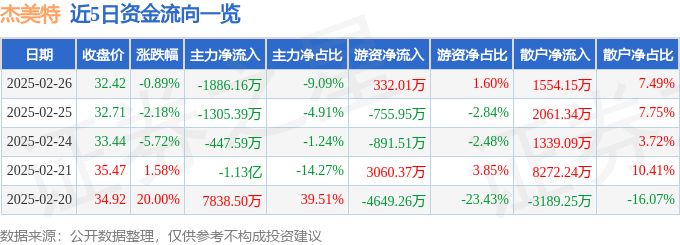 截至2025年2月26日收盘,杰美特(300868)报收于32.42元,下跌0.89%,换手率7.97%,成交量6.39万手,成交额2.07亿元。