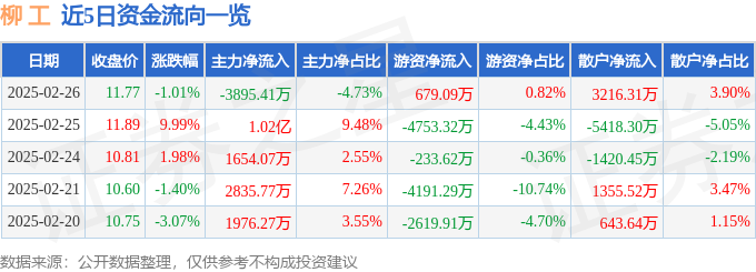 截至2025年2月26日收盘,柳 工(000528)报收于11.77元,下跌1.01%,换手率4.68%,成交量69.38万手,成交额8.24亿元。