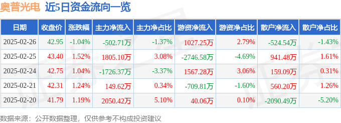 2月26日的资金流向数据方面,主力资金净流出502.71万元,占总成交额1.37%,游资资金净流入1027.25万元,占总成交额2.79%,散户资金净流出524.54万元,占总成交额1.43%。