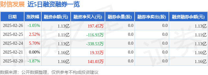 财信发展融资融券信息显示,融资方面,当日融资买入662.47万元,融资偿还465.02万元,融资净买入197.45万元。融券方面,融券卖出0.0股,融券偿还0.0股,融券余量0.0股,融券余额0.0万元。融资融券余额1.13亿元。