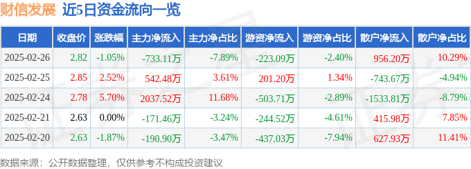 截至2025年2月26日收盘,财信发展(000838)报收于2.82元,下跌1.05%,换手率3.1%,成交量32.68万手,成交额9295.18万元。