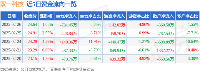 2月26日的资金流向数据方面,主力资金净流出781.45万元,占总成交额3.35%,游资资金净流入1142.02万元,占总成交额4.9%,散户资金净流出360.58万元,占总成交额1.55%。