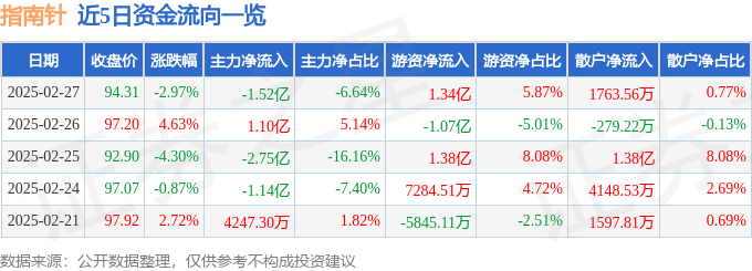 截至2025年2月27日收盘,指南针(300803)报收于94.31元,下跌2.97%,换手率5.93%,成交量24.14万手,成交额22.9亿元。
