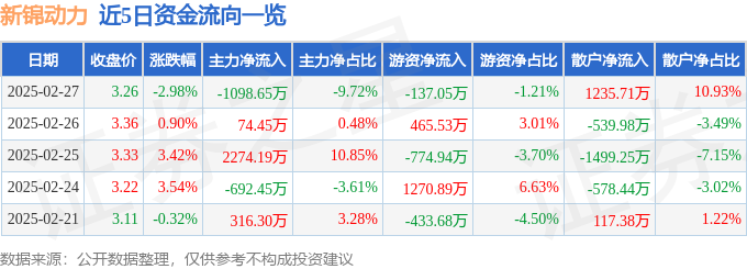 2月27日的资金流向数据方面,主力资金净流出1098.65万元,占总成交额9.72%,游资资金净流出137.05万元,占总成交额1.21%,散户资金净流入1235.71万元,占总成交额10.93%。