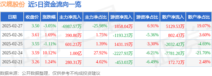 截至2025年2月27日收盘,汉缆股份(002498)报收于3.5元,下跌3.05%,换手率2.3%,成交量76.49万手,成交额2.69亿元。
