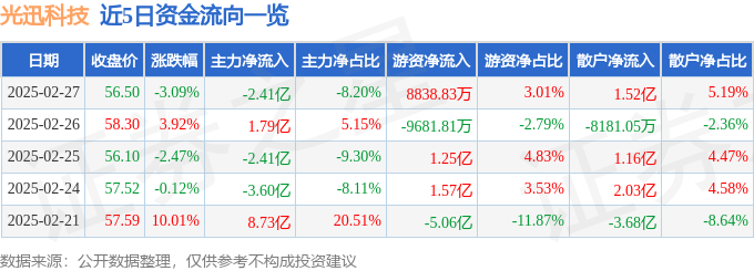 截至2025年2月27日收盘,光迅科技(002281)报收于56.5元,下跌3.09%,换手率6.66%,成交量51.49万手,成交额29.35亿元。