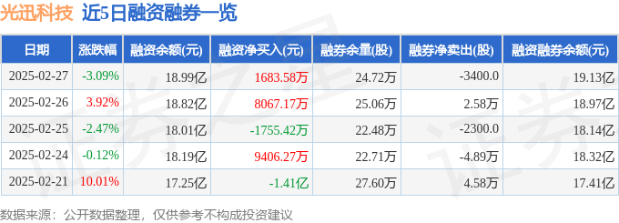 光迅科技融资融券信息显示,融资方面,当日融资买入3.83亿元,融资偿还3.66亿元,融资净买入1683.58万元。融券方面,融券卖出4800.0股,融券偿还8200.0股,融券余量24.72万股,融券余额1396.87万元。融资融券余额19.13亿元。