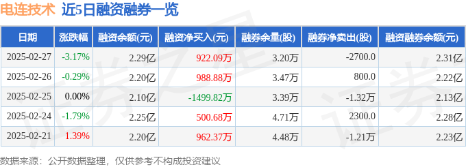 电连技术融资融券信息显示,融资方面,当日融资买入2798.51万元,融资偿还1876.42万元,融资净买入922.09万元。融券方面,融券卖出2300.0股,融券偿还5000.0股,融券余量3.2万股,融券余额201.51万元。融资融券余额2.31亿元。