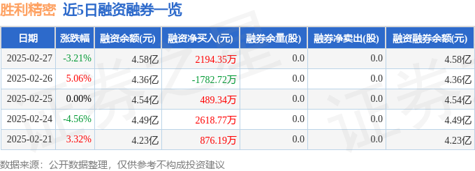 胜利精密融资融券信息显示,融资方面,当日融资买入1.01亿元,融资偿还7873.02万元,融资净买入2194.35万元。融券方面,融券卖出0.0股,融券偿还0.0股,融券余量0.0股,融券余额0.0万元。融资融券余额4.58亿元。