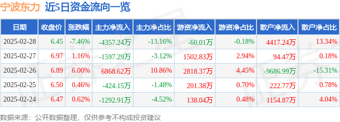 截至2025年2月28日收盘,宁波东力(002164)报收于6.45元,下跌7.46%,换手率10.49%,成交量50.35万手,成交额3.31亿元。