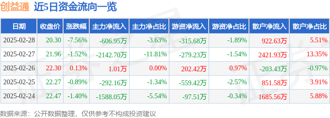 截至2025年2月28日收盘,创益通(300991)报收于20.3元,下跌7.56%,换手率8.88%,成交量7.98万手,成交额1.67亿元。
