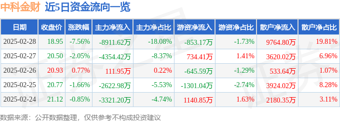 截至2025年2月28日收盘,中科金财(002657)报收于18.95元,下跌7.56%,换手率7.49%,成交量25.18万手,成交额4.93亿元。