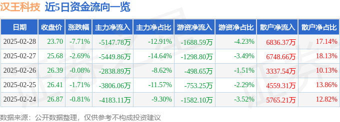 截至2025年2月28日收盘,汉王科技(002362)报收于23.7元,下跌7.71%,换手率7.87%,成交量16.33万手,成交额3.99亿元。