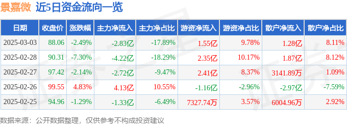 截至2025年3月3日收盘,景嘉微(300474)报收于88.06元,下跌2.49%,换手率5.42%,成交量17.73万手,成交额15.82亿元。