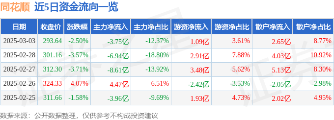 截至2025年3月3日收盘,同花顺(300033)报收于293.64元,下跌2.5%,换手率3.71%,成交量10.23万手,成交额30.29亿元。