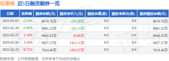 纽泰格融资融券信息显示,融资方面,当日融资买入1052.97万元,融资偿还1263.53万元,融资净偿还210.56万元。融券方面,融券卖出0.0股,融券偿还0.0股,融券余量0.0股,融券余额0.0万元。融资融券余额8670.76万元。