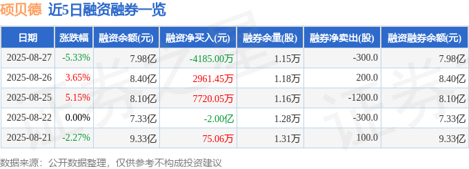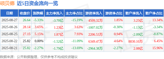 截至2025年8月27日收盘,硕贝德(300322)报收于26.64元,下跌5.33%,换手率20.05%,成交量88.48万手,成交额24.35亿元。